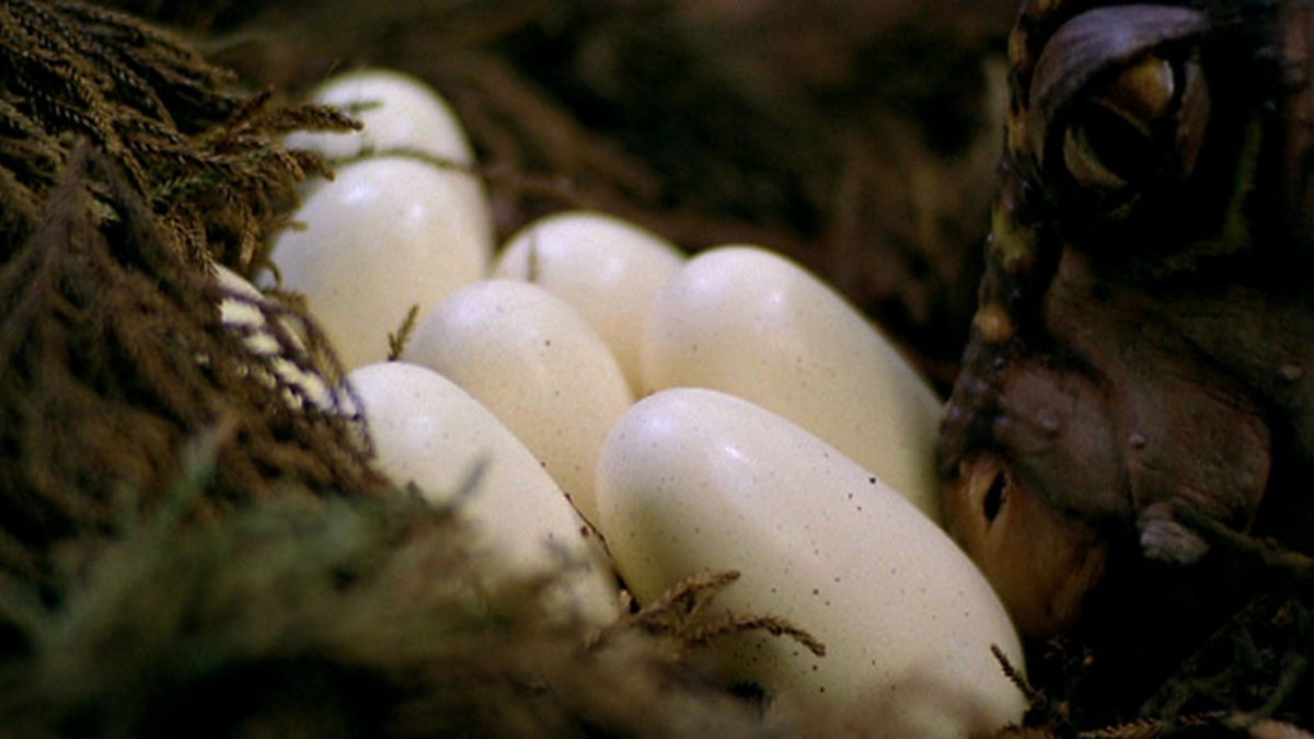 A herd of Leaellynasaura struggle to survive at the South Pole during the Cretaceous period. A Leaellynasaura mother has an unusual defence against mammalian egg thieves.