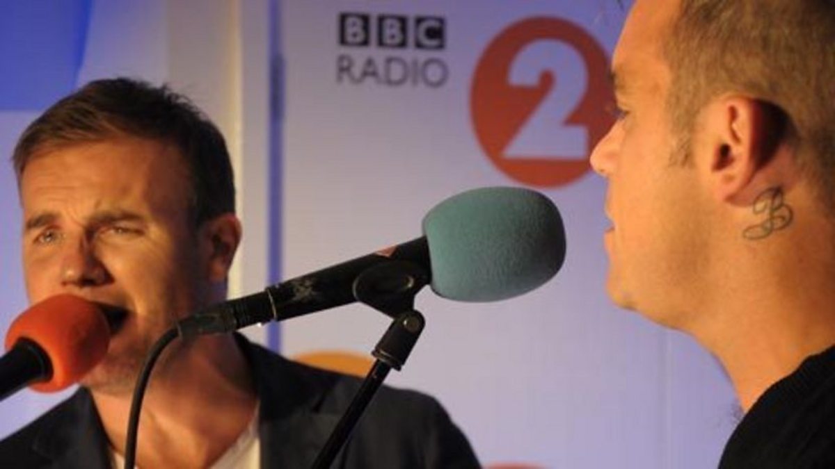 Watch reunited Take That band-mates Robbie Williams and Gary Barlow perform their current single 'Shame' for Simon Mayo in Radio 2's Great British Songbook Library.