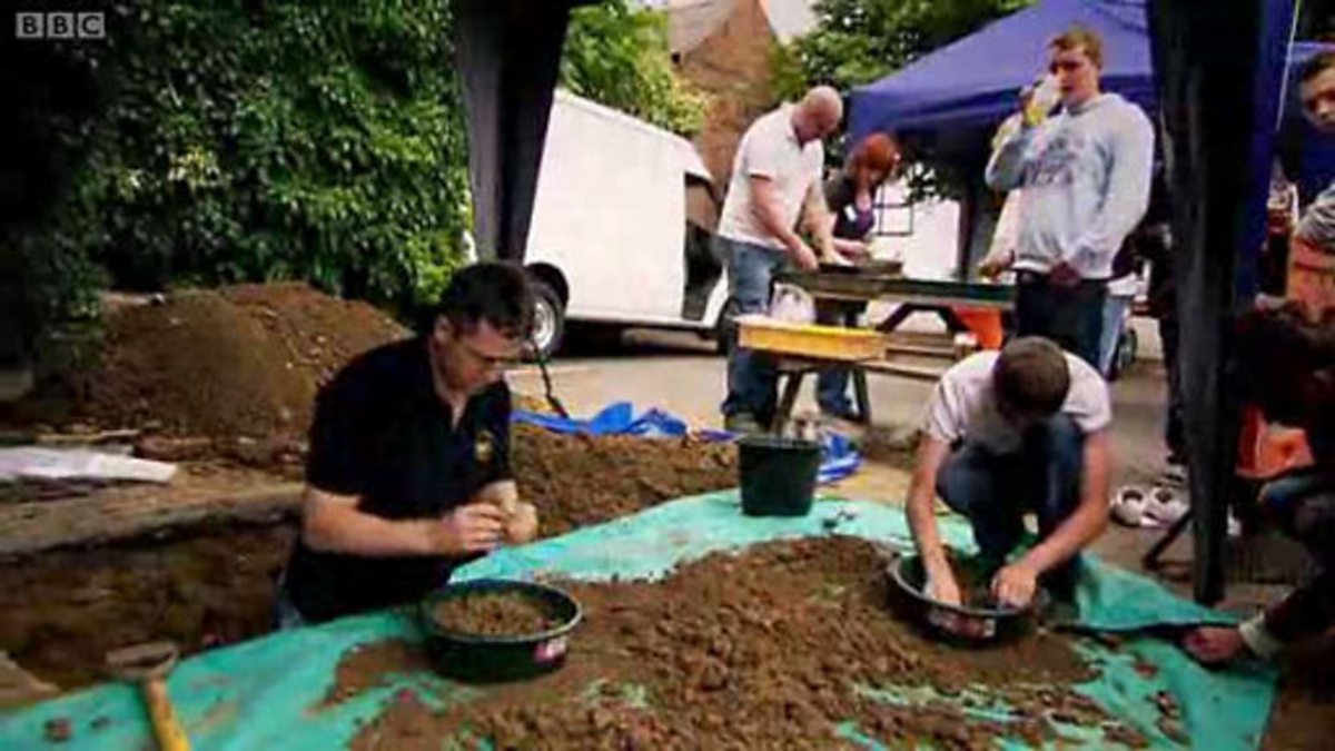 Michael Wood helps uncover pottery fragments from the local pub car-park which suggest there has been occupation on the site since Anglo-Saxon times.
