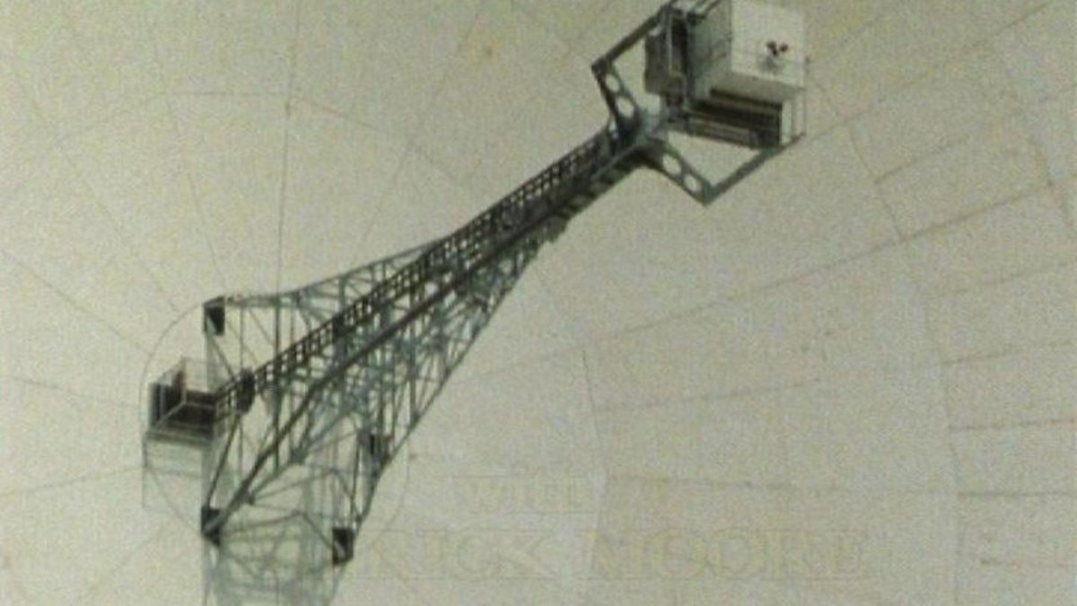 Sir Patrick Moore explains the basics of radio astronomy while on a visit to Jodrell Bank Observatory.