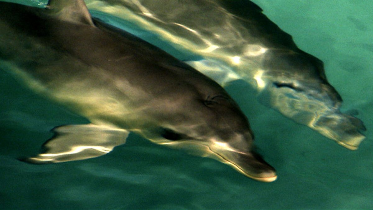 Newly observed behaviour as an older female shows a dolphin calf how to fish.