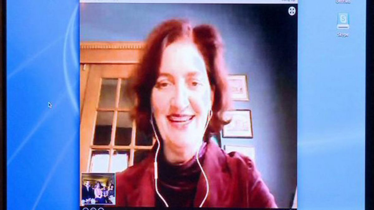 Emma Donoghue, author of "Room," is interviewed by the Comrie book group via an online video link.