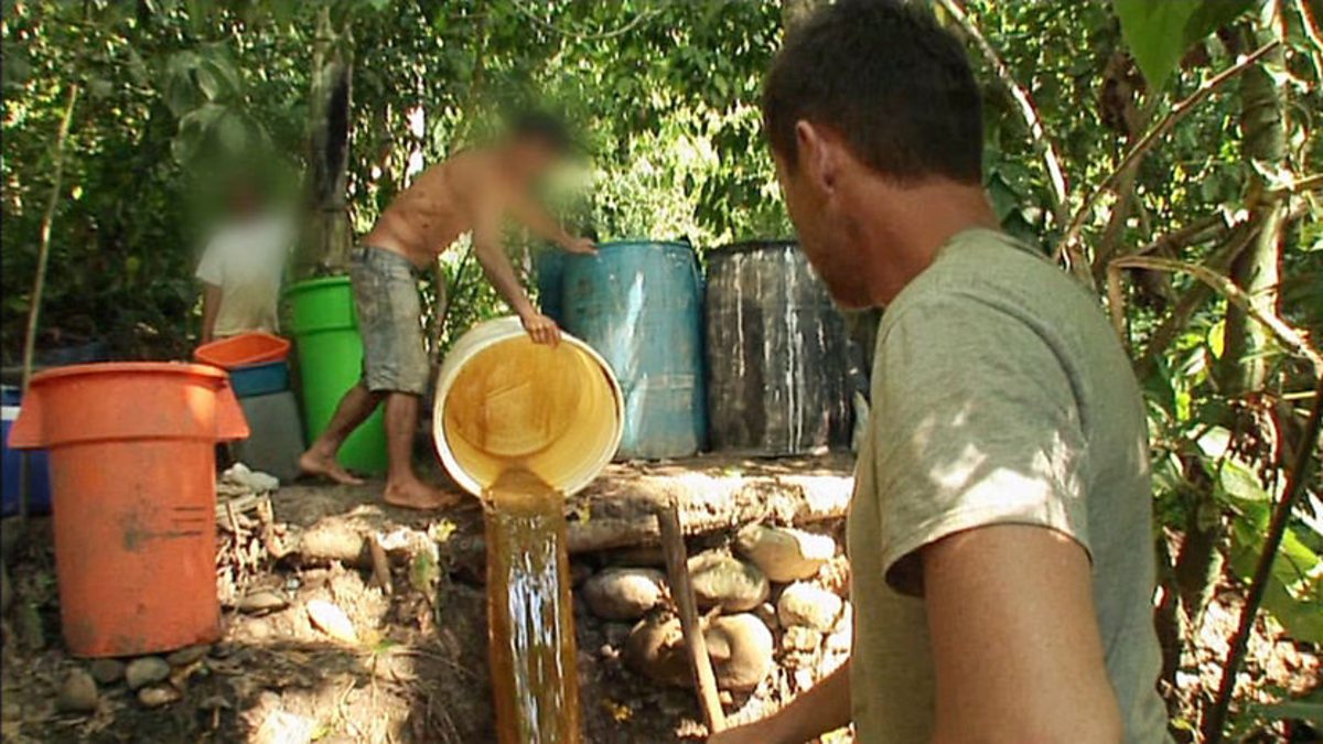 Bruce Parry observes an illegal cocaine making 'bossa', hidden deep in the jungle.