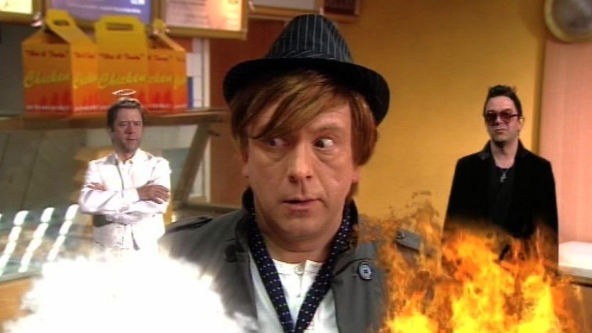 Mark Owen is torn between the angel and devil in his conscience. He is in conflict over unpaid chips and can’t decide whose advice to take, should he go with the ‘good’ Gary Barlow or the ‘devil’ Robbie Williams.