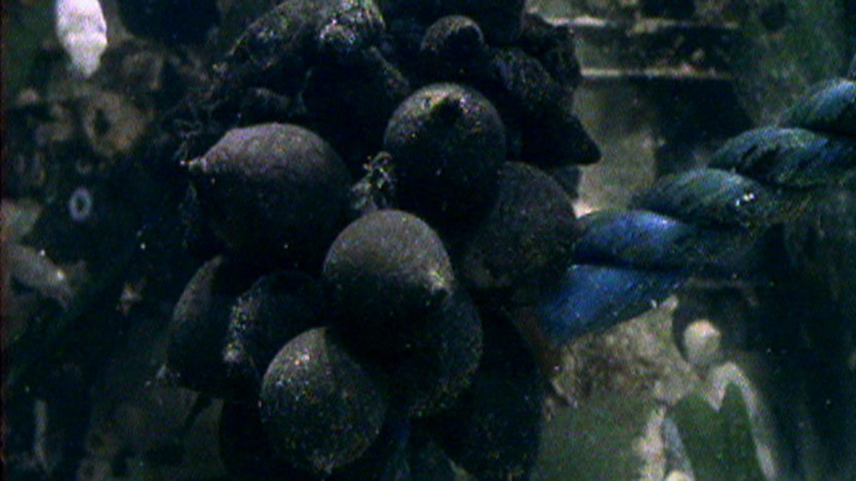 Cuttlefish only visit Britain's warmer southern waters in summer, and stay with us for a couple of months. Once they've mated they lay their eggs which are usually attached to seagrass - but an old bit of mooring rope is an equally good nursery. As they begin to emerge the eggs are first fertilised by sperm stored near the female's mouth, then they are stained with ink to camouflage them.They emerge from a tube beneath her tentacles, and their stalk is twined about the rope to anchor them safely. They'll take about six weeks to develop. The mini-replica of the adult is about the size of a pea. Even at this stage it can squirt ink and is a master of camouflage.