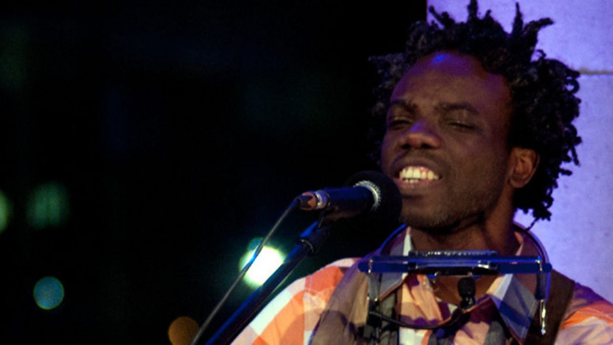 Football fan and one-man band Muntu Valdo brings his unique music to the foyer of BBC's Pacific Quay.