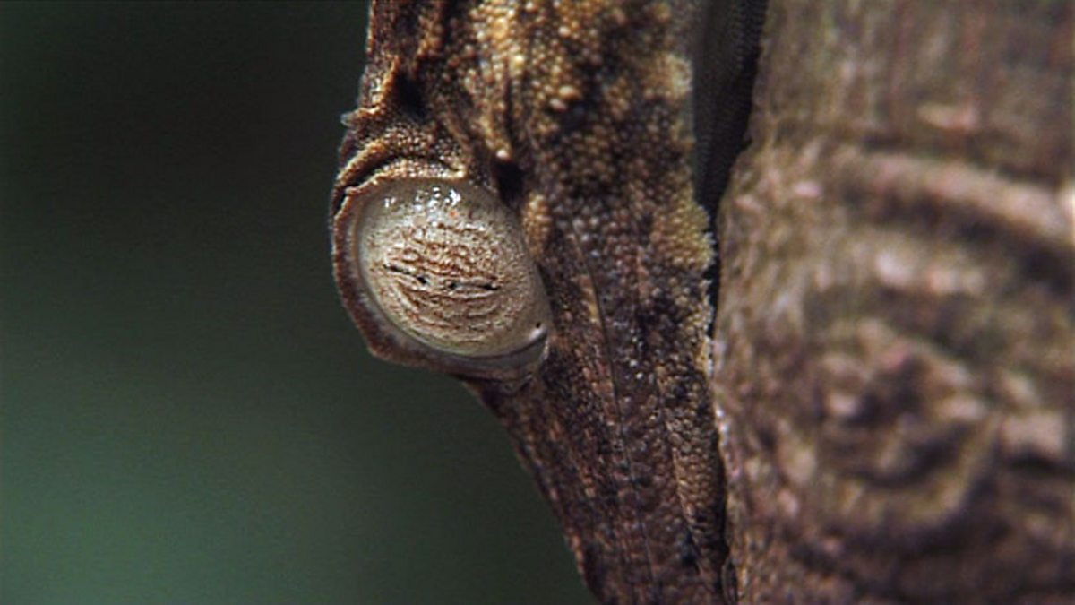 The leaf tailed gecko has extra skin flaps and coloured irises.