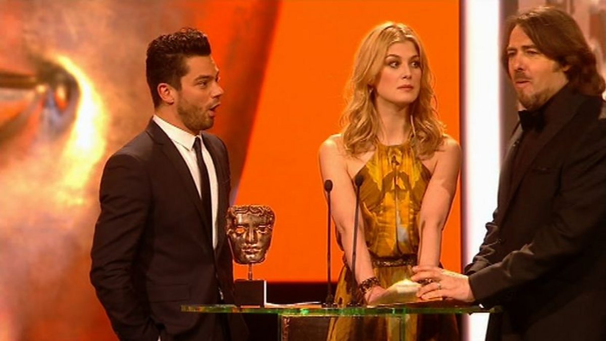 Struggling with the autocue, Rosamund Pike almost announces a BAFTA award winner before the nominations are shown...