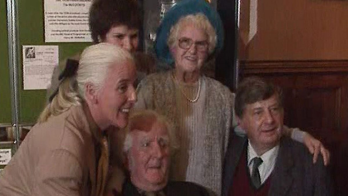 James Ellis presents a sculpture of Joseph Tomelty at an Arts Council ceremony on 1st October 1991 attended by Joe's wife, daughters Roma and Frances as well as many from the theatre world. The portrait head was commissioned by the Arts Council of Northern Ireland from sculptor Carolyn Mulholland.