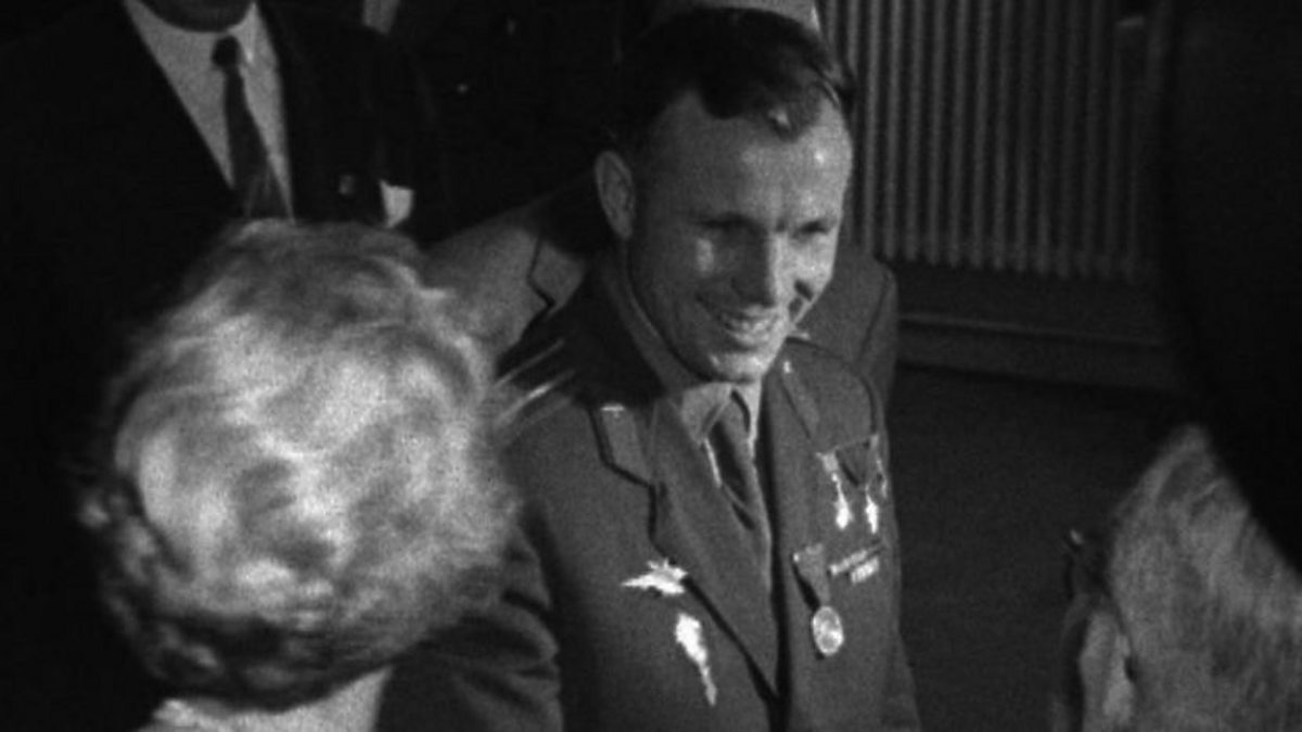 Yuri Gagarin gives an unexpected interview to BBC reporter Peter Woods at a champagne reception held in his honour in July 1961. His answers are translated into English by Boris Belitsky of Radio Moscow.