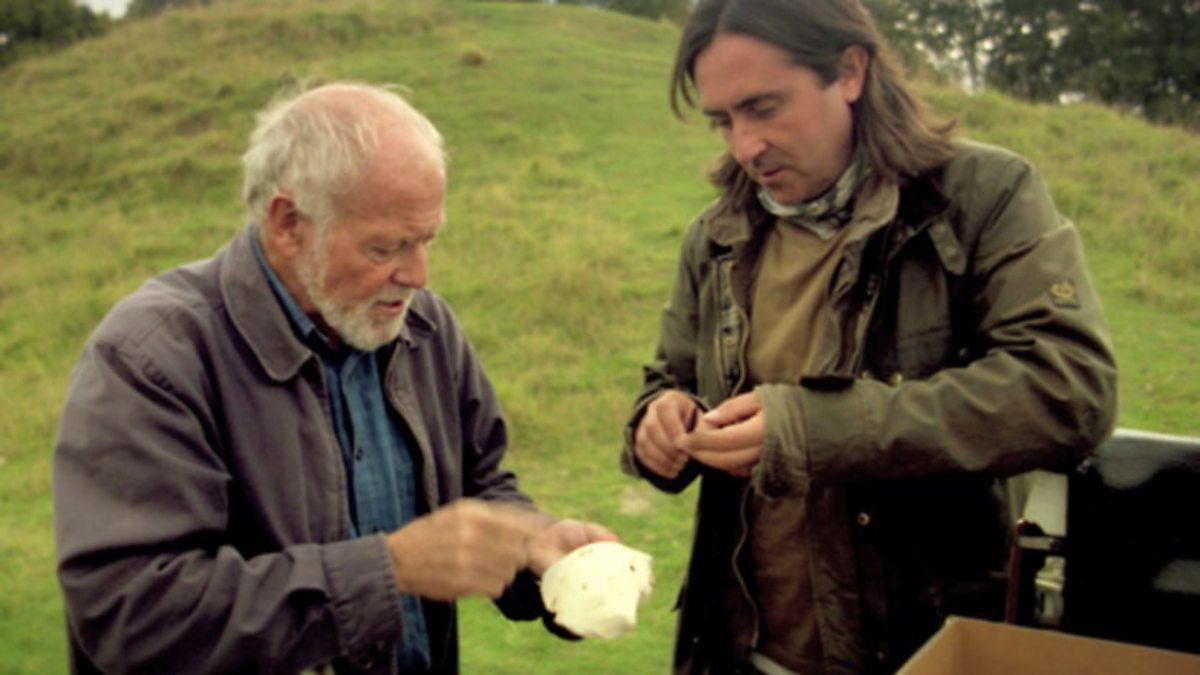 Neil and Barry Cunliffe look at spearheads and skulls at Danebury Hill Fort.