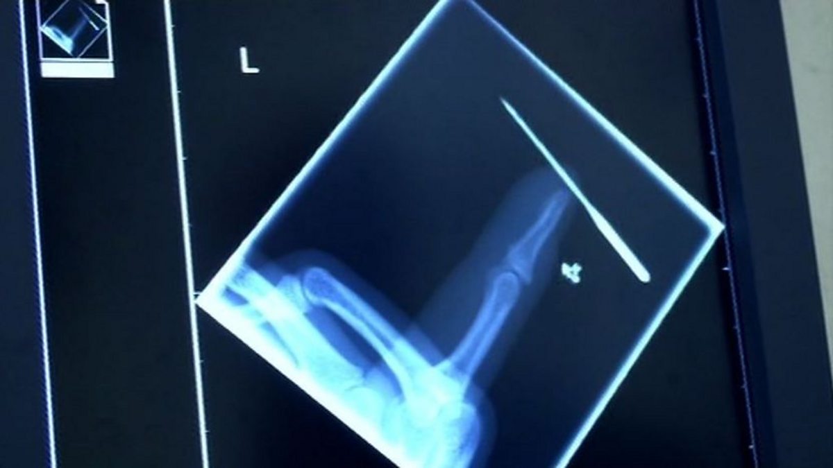 A art student has had an accident with a sewing machine.