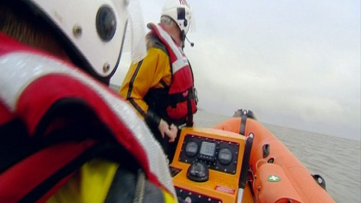 Eddie Butler showing how the RIB boat (Rigid Hulled Inflatable Boat) was originally designed and built at Atlantic College, St Donat's, in the 1960's. It has since been adopted by the RNLI becoming the world's most widely used craft for inshore rescue.