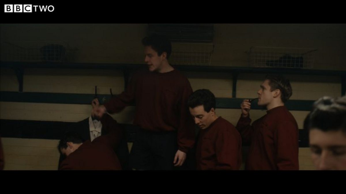 Jimmy Murphy (David Tennant) gets impatient as the team banter over United and City in the changing room.