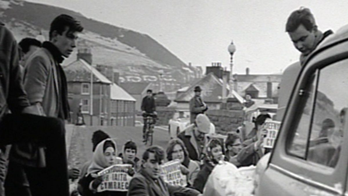 Description of Welsh language protests by the Welsh Language Society through the 1960s against English only road signs with an interview with one of its leaders describing the non violent nature of the protests, influenced by the words of Saunders Lewis in 1962.