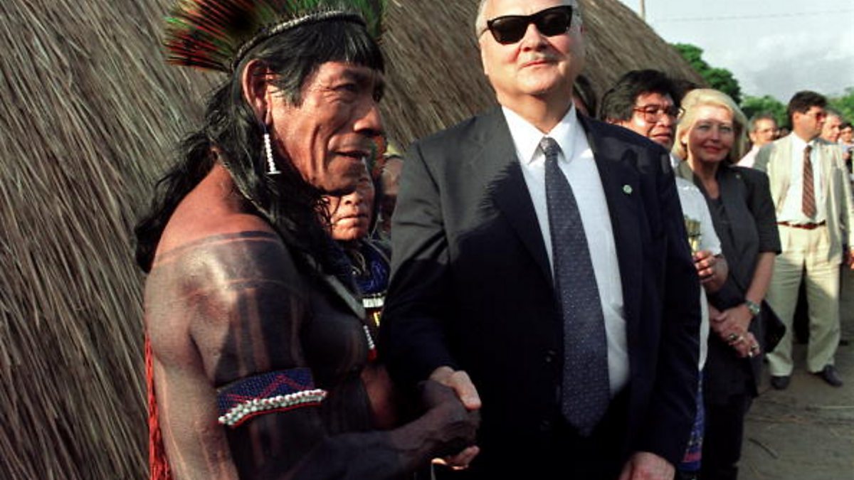 Photo: Maurice Strong (right) shakes hands with Brazilian Indian Chief Kanhok Caiapo. AFP/Getty.