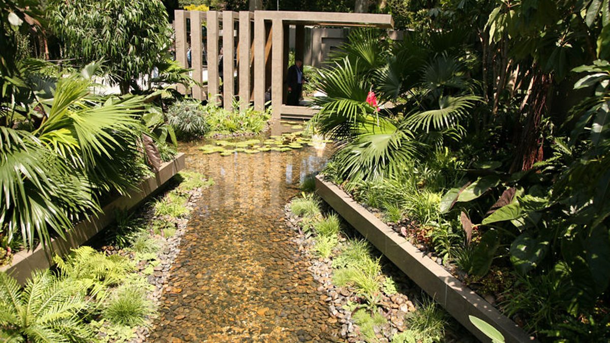 The garden is inspired by the ravine ecosystems of Malaysia and the internal courtyards ubiquitous of the hot and humid country. A sunken pavilion is surrounded by water and tropical plants including a waterlily, which needs a specially heated root zone to survive in the UK, fill the pebble-lined pools. Many of the plants in this garden may be recognised as houseplants commonly used in the UK.