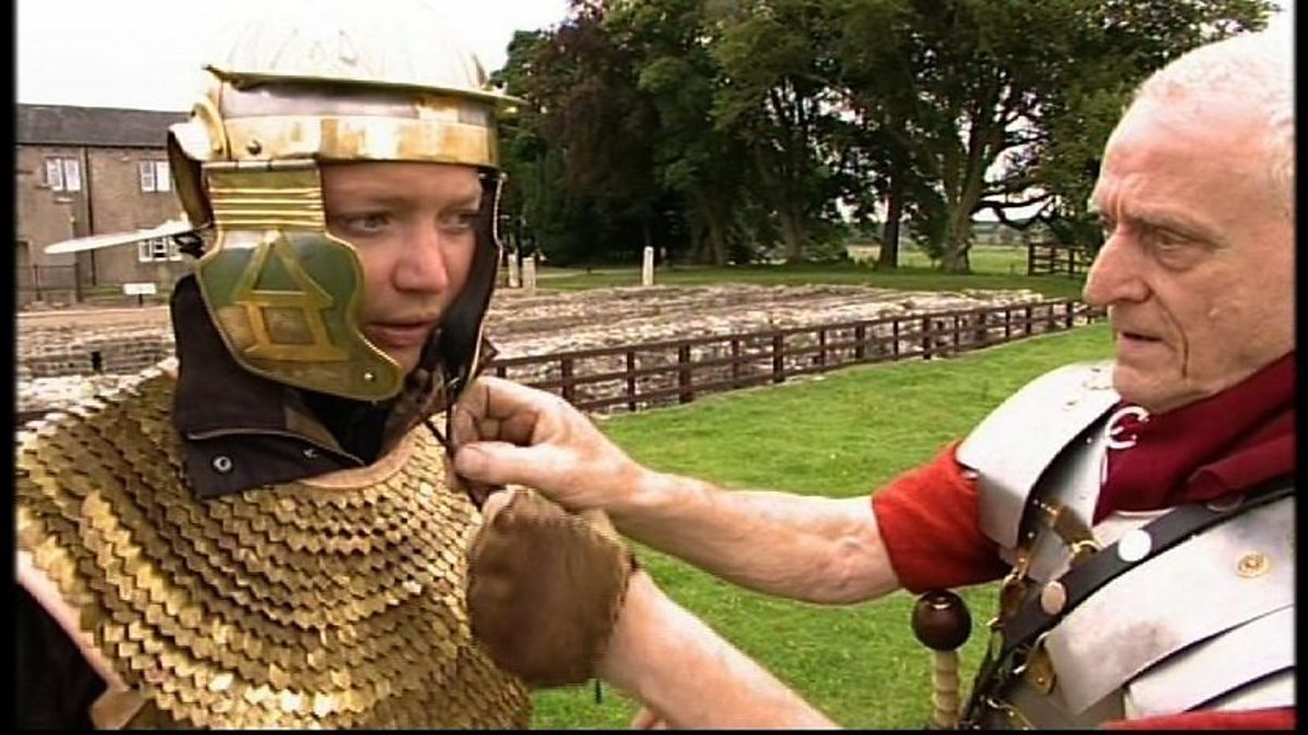 Jodie Kidd dresses up as a Roman legionary soldier and fires a catapult whilst visiting Birdoswald Fort along Hadrian's Wall.