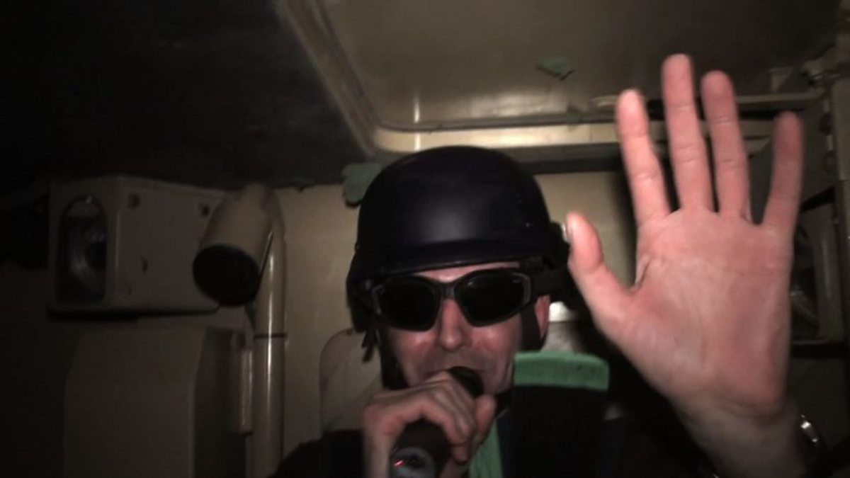 Tim Westwood gets turned upside down as he tries out the Mastiff simulator. It's used to train troops how to react when the armoured vehicle is knocked over and they need to evacuate themselves and injured comrades.