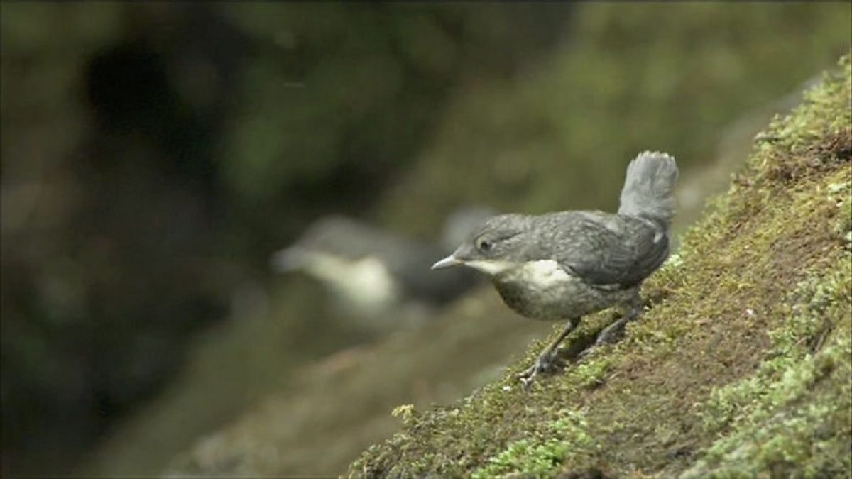 Kate Humble and Chris Packham commentate as cameras catch the first outing for three dipper fledglings.
