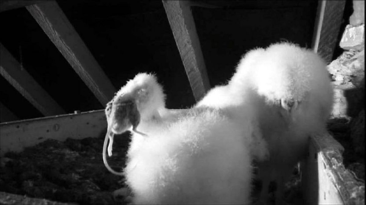 Chris Packham and Kate Humble show how the smallest barn owl ("Bob") is obviously determined to get bigger.