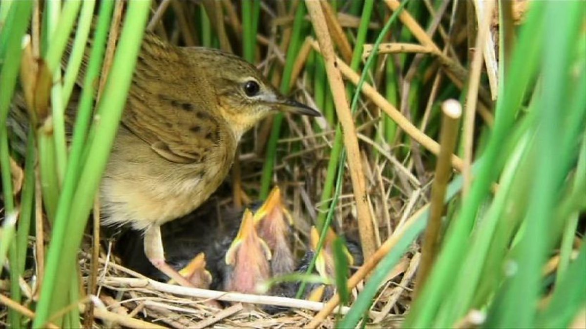 Carefully hidden among long grass is a nest complete with hungry chicks.