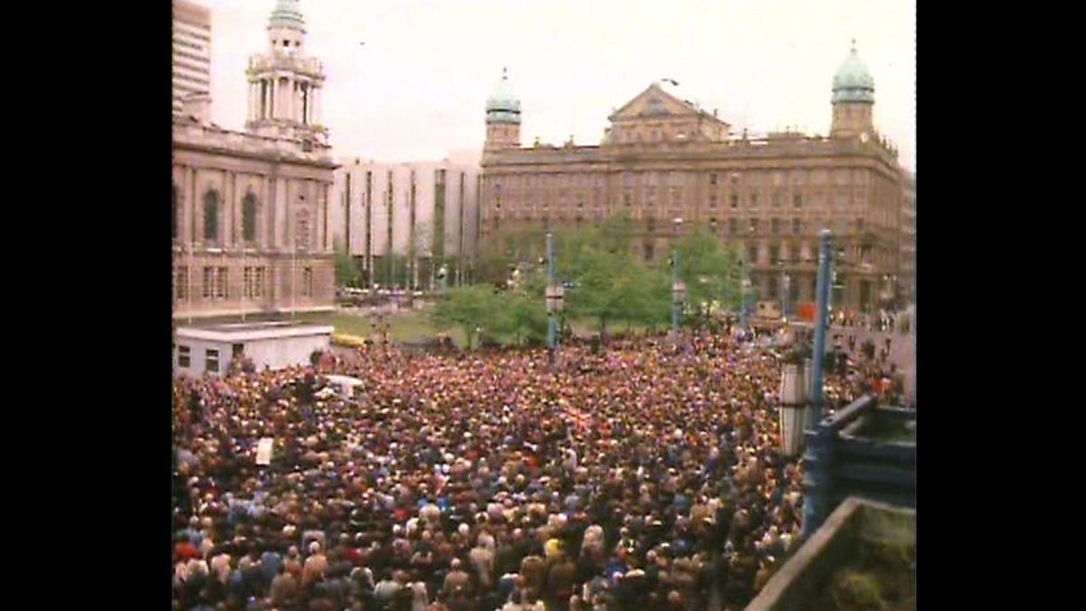 While Bobby Sands' funeral is taking place in west Belfast more than two thousand loyalists gather at Belfast City Hall to remember the victims of IRA terrorism. The service, convened and conducted by Rev Ian Paisley, is an opportunity for the relatives of IRA victims to express their resentment at what they see as the glorification of terrorists. Paisley tells the crowd that Sands chose to take his life but IRA victims had no choice. Relatives laid wreaths at the cenotaph and dispersed quietly having made their point.