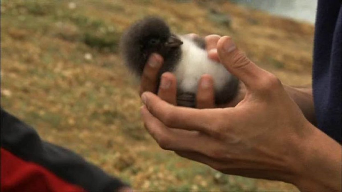 Iolo Williams gets to watch as one the Skomer reserve wardens briefly removes a puffin chick from its burrow to weigh and measure it.