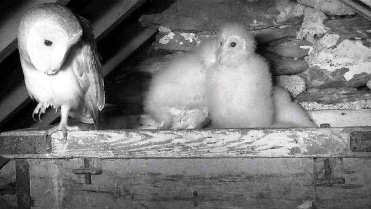 When a squirrel gets close to a nest of four barn owl chicks, one of the parents is quick to assert its presence.