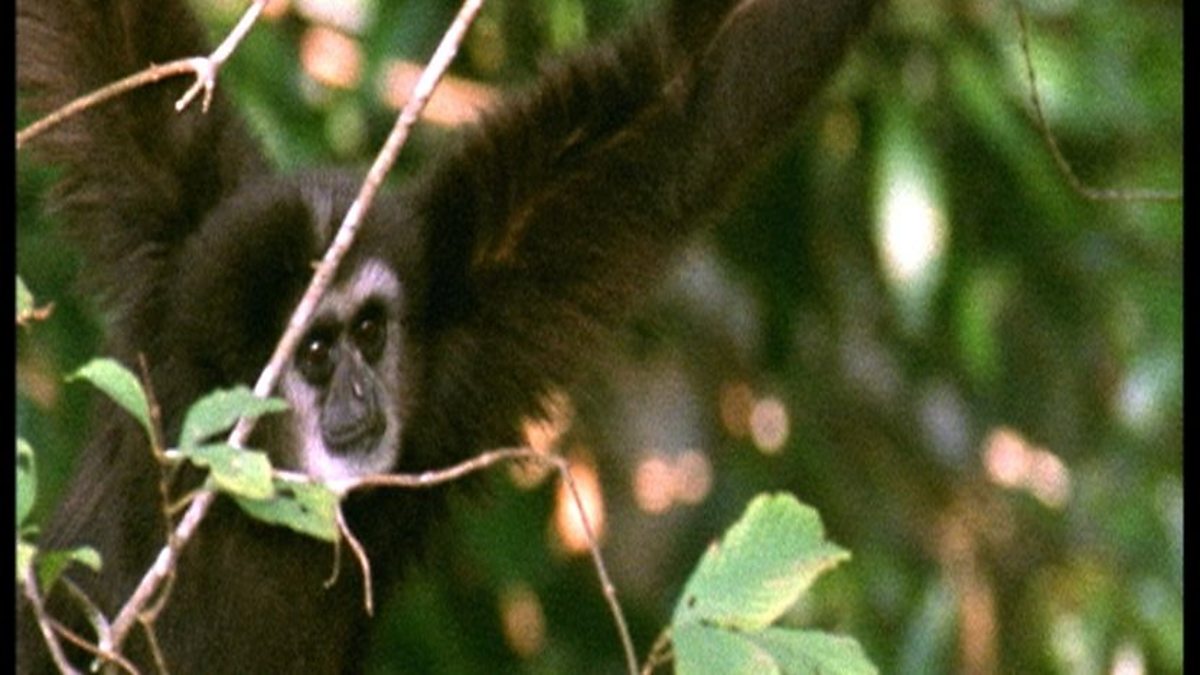 You have to be pretty agile and adept in the trees to move around confidently at such a great height. This baby white-handed gibbon is about two and starting to explore, though his parents are close by. He’ll need their guidance and protection for several more years and the whole family are completely committed to each other. Males and females can either be blonde or dark, just like us. Apes are larger than monkeys and don’t need a tail. They’ve found a new way of getting around. Generally, we take for granted the flexibility of our wrist and shoulder joints. Maybe to us it seems like a rather an insignificant ability, as we rely on our legs to get about, but to gibbons it isn’t. Too big to run around on top of most branches, they usually use their arms to swing underneath and they’ve taken that flexibility to extremes. This ability to completely rotate the shoulder joint allows them to swing from branch to branch. Perhaps we evolved our shoulder joints for similar reasons, but eventually it‘s what made it possible for our forebears to throw over-arm and hunt with a spear. Gibbons have incredibly strong arms and use their hands as hooks. And just like gymnasts, they use their body weight to swing. Because they hang suspended underneath the branches, they have a far more vertical, straighter posture than most monkeys, which means if they want to travel on top of the branches they stand upright balancing like a tight-rope artist. It‘s likely that this was a crucial stage in the process which eventually led us to walk on two legs. After the acrobatics, a refreshing drink of water in a tree-hollow is welcome. But if you’ve got a real thirst you’ve got to go down to the river. Hands make a perfect cup to scoop up water - a technique this baby is learning too. Before long, they’re in full chorus again, reconfirming their marriage vows.