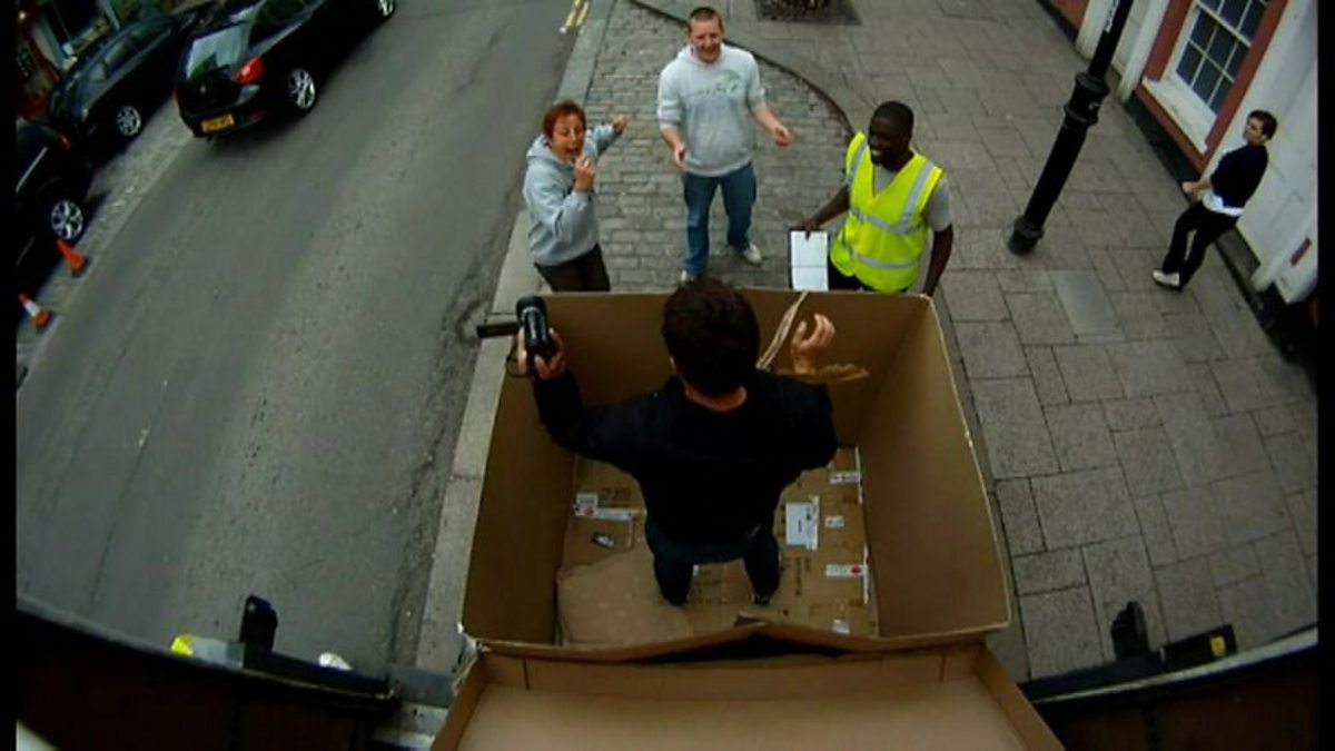 For Clare's surprise, John was in a box! Yes, a large package was delivered to Clare and she had no idea what it was - after much debate she accepted the package only to have John burst out of it and reveal that she was off to cycle with Olympic champion Chris Boardman - not only that, she'd be racing him at the 2012 Olympic Velodrome which hasn't even been used yet by professional competitors.