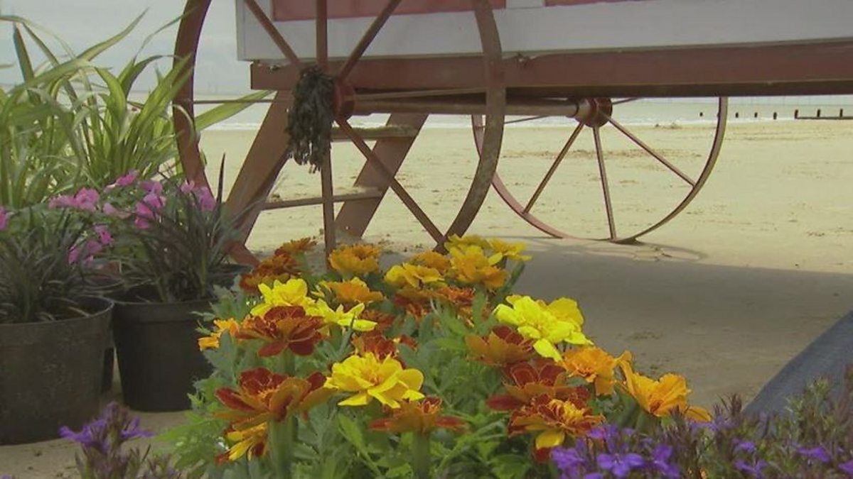 The flower bed has a bathing machine at the centre and uses bright yellow and orange marigolds for sand and the sea is represented by blue lobelias. Anemone and seaweed covered rocks will be simulated by house leeks (Sempervivums) and Ophiopogon planiscapus 'Nigrescens' (black lily turf).