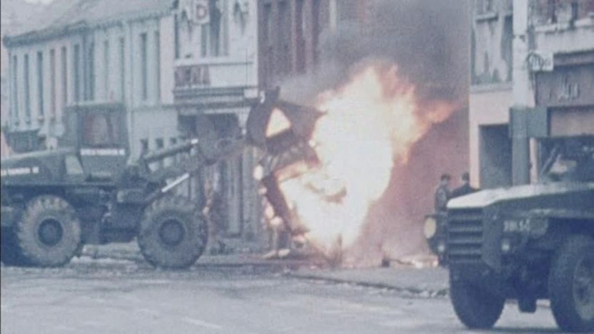 John Humphrys reports on the escalating violence following the death of Harry Thornton who was shot by a soldier when his engine backfired outside a police station in west Belfast.