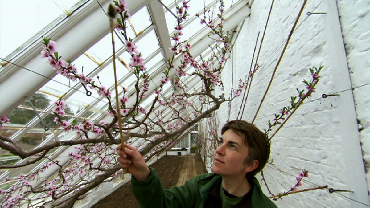 Indoor peach blossoms flower early in the season, heralding the start of the year for the gardeners at Heligan. The flowers come out earlier than the majority of pollinating insects, so the gardeners lend a helping hand by using a rabbit's tail like a paint brush to delicately move the pollen from one flower to another.