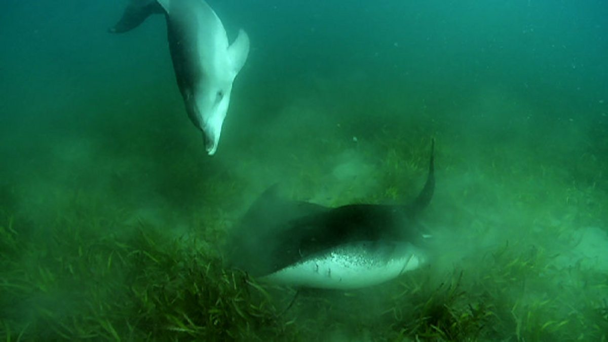 A common bottlenose dolphin shadows a stingray to find its favourite food.