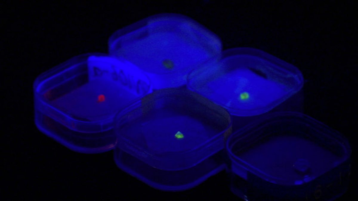 Jem and Dr Mark Newton shine ultraviolet light onto synthetic diamonds, making them glow to reveal their different properties and uses. It seems that these diamonds could one day be everyone's best friend.