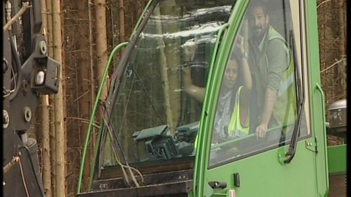 Liz Bonnin fells and strips a tree with the help of a big machine