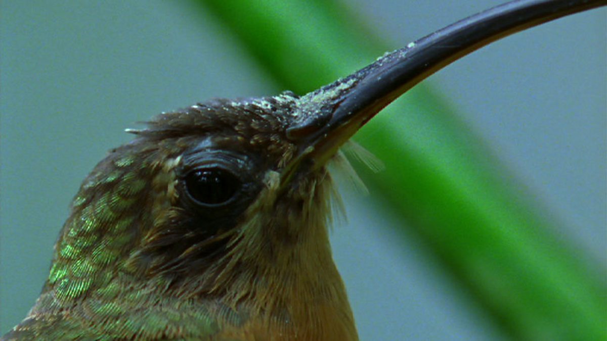 A bronzy hermit hummingbird gathers silk from a spiders web and weaves a pocket to cradle her young.
