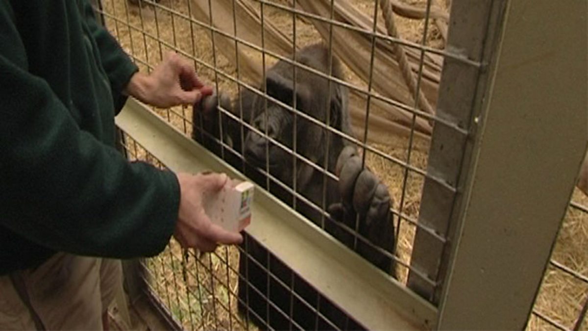 Watch a female gorilla named Zaire getting her fingers coloured to encourage her to draw.