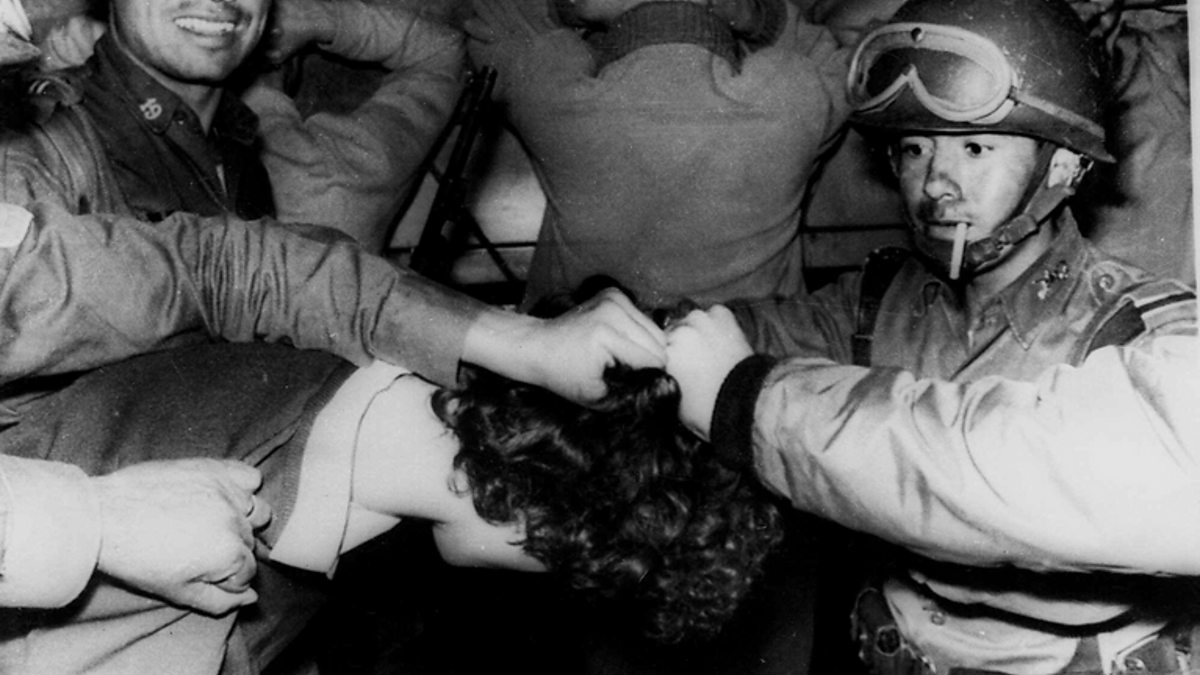 Photo: Mexican soldiers arresting students after the shooting (Associated Press).