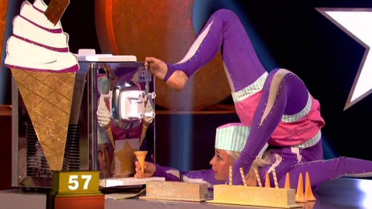 Jessica needs to serve up three ice creams for the celebrity guest panel. It would be easy if she didn't have to use her feet… Will she Epic Win or Epic Fail?