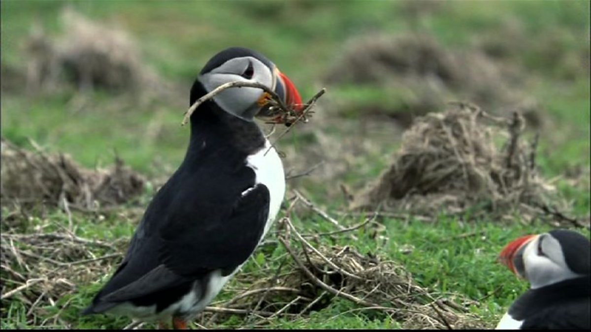 Puffins reunite with mates from the previous year and begin nest building on Skomer Island.