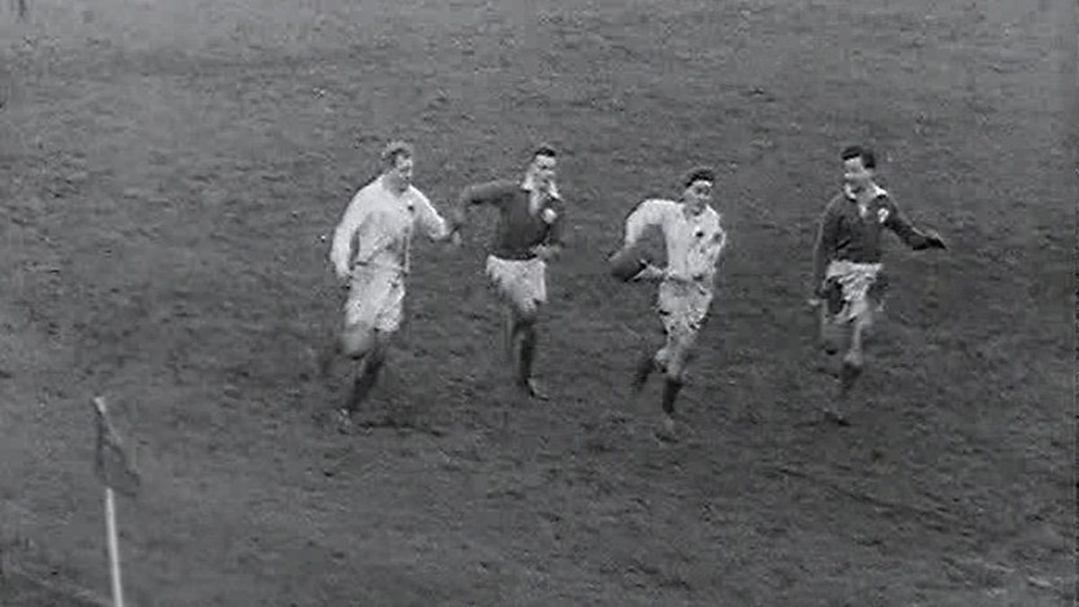 Ireland take on England in a closely fought rugby Five Nations Championship encounter at Landsdowne Road, Dublin in 1955.