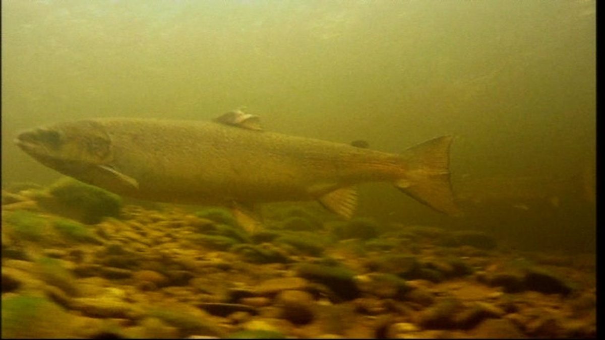 Presenter Charlie Hamilton-James swims with wild salmon.