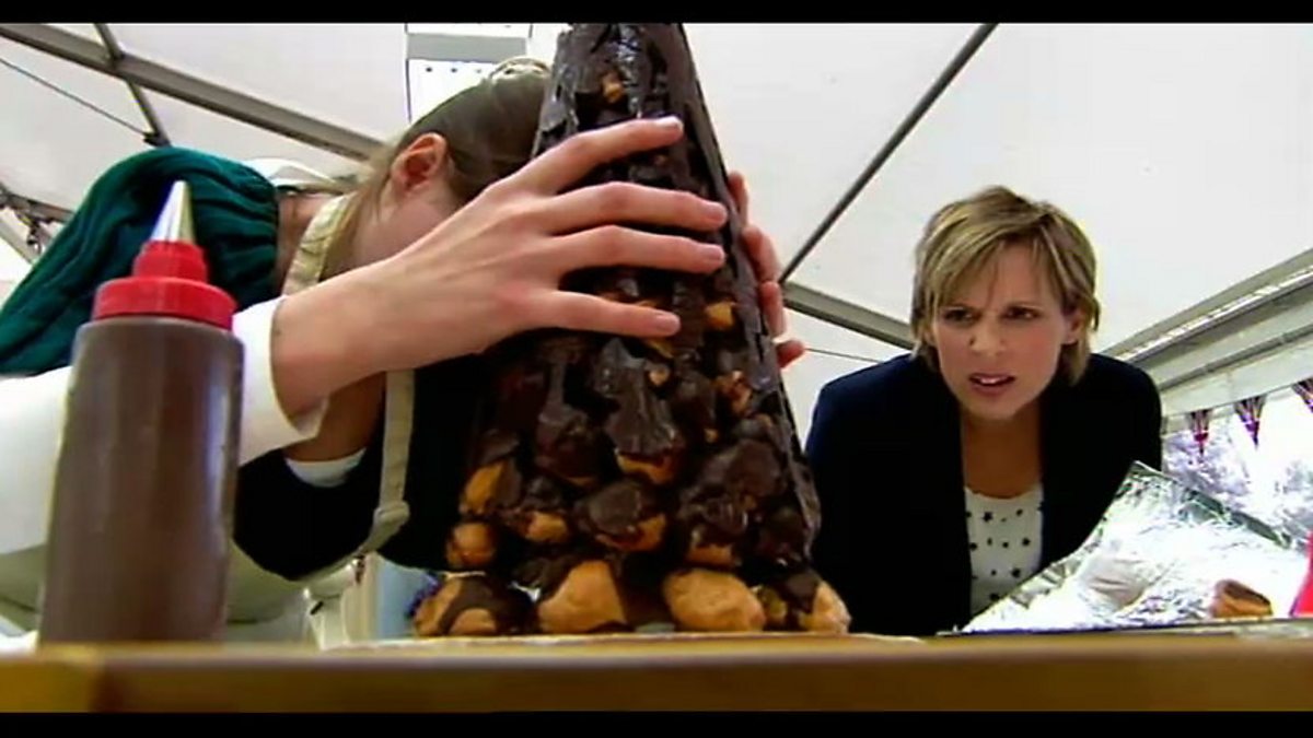 Mary-Anne and Jo make spun sugar to decorate their towers, Holly finds time to bake and decorate a perfect miniature gingerbread house for inside her croquembouche and Yasmin discovers if her tower will remain upstanding when it comes out the cone.