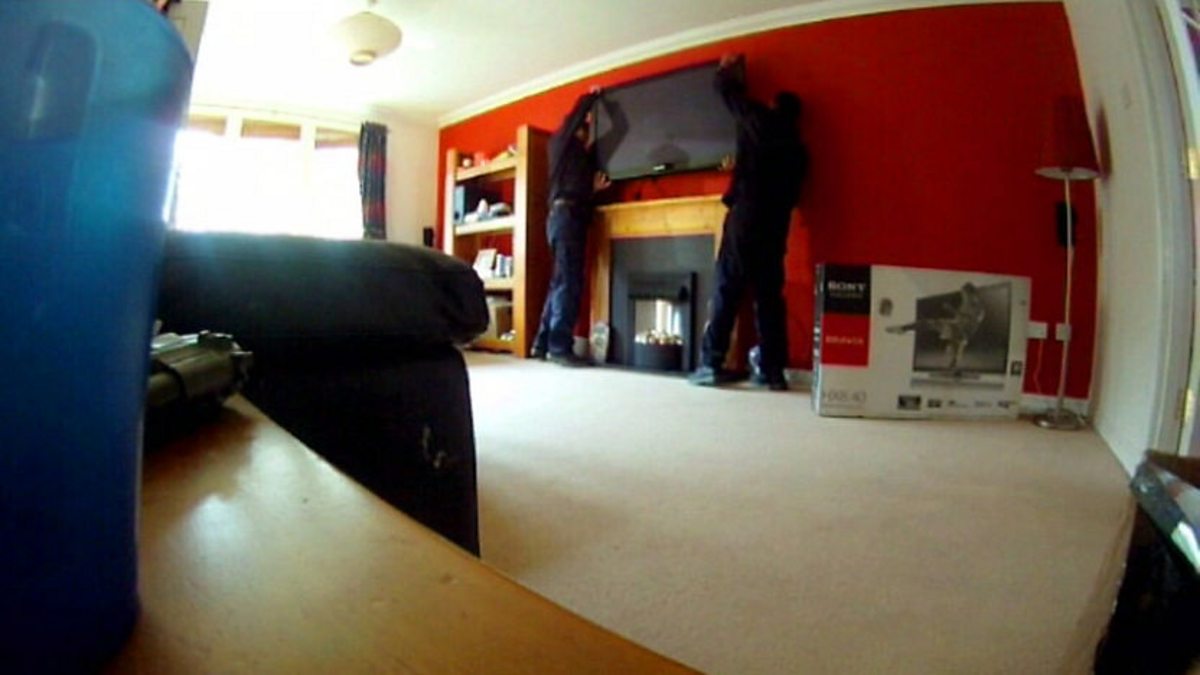 Alex and Jazz pose as employees of a delivery firm. The mark thinks that he's getting a free top-of-the-range 3D TV, but he's actually going to be left looking at a blank space on his wall where his own TV used to be before the day is out.