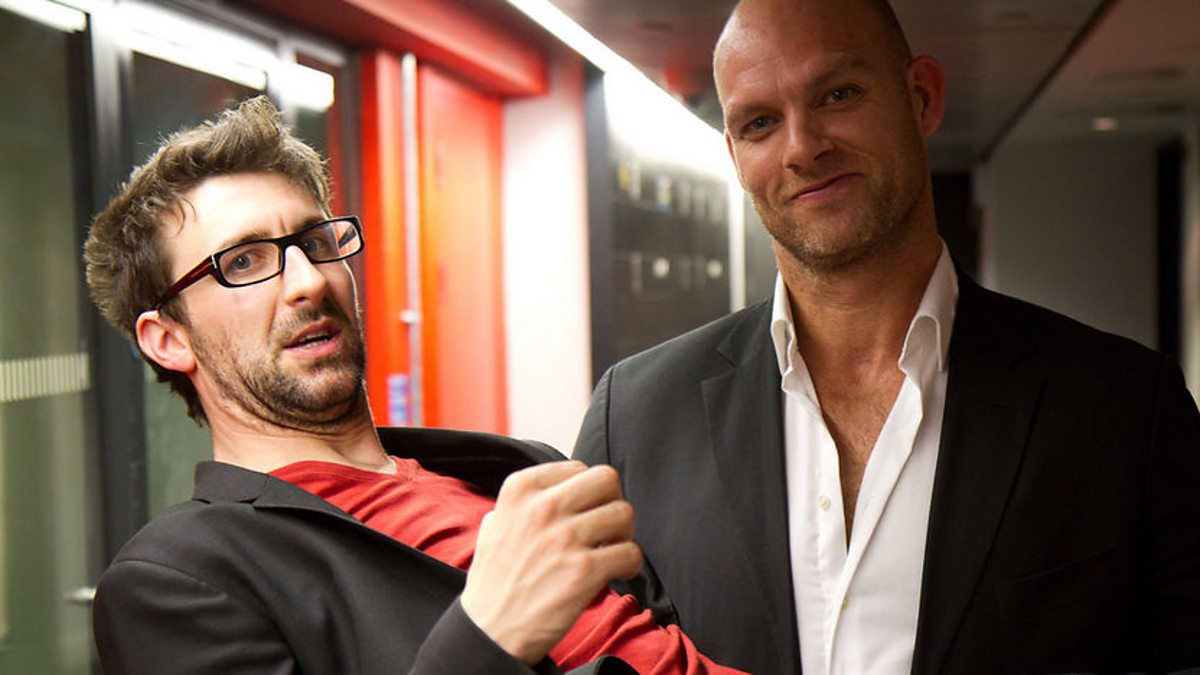 Mark Watson finishes the first episode of his Live Address to the Nation in the arms of James Crossley, aka Hunter from the TV series Gladiator.