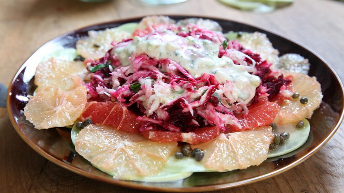 You might not have come across kohlrabi but it is a wonderful veg - cooked or raw. This bright recipe pairs it with some refreshing grapefruit and a creamy dressing for a great winter salad.