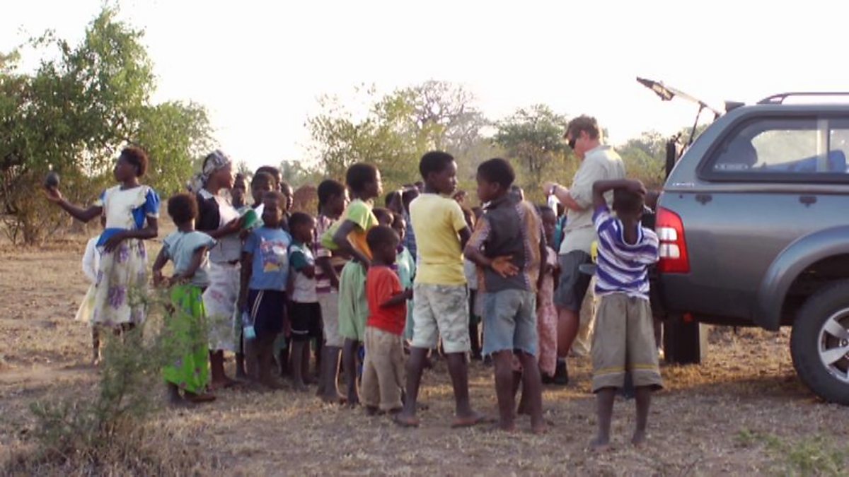 A look at the efforts of Jeff, the programme’s fixer, to distract local children while the crew film a sequence with Neil Oliver by the River Shire in Malawi.