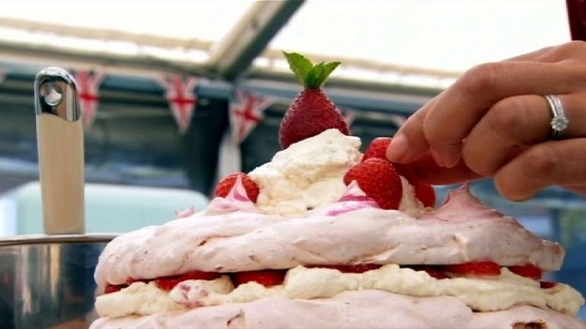 Sarah Hadland sprinkles the hair on her handmade sugarpaste face, Joe Swift works in the freezer to stop his chocolate decoration from melting, Angela Griffin stacks her strawberry and hazelnut pavlova and James Wong assembles in mini meringue nests.